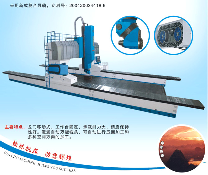 本机床为五面体龙门移动式加工中心。龙门移动、工作台固定,龙门底座与工作台固连为一体,承载能力大,精度保持性好。可进行铣、镗、钻等工序加工,自动化程度高。适用于航空航天、模具、船舶等需加工大中型复杂零件的制造领域。